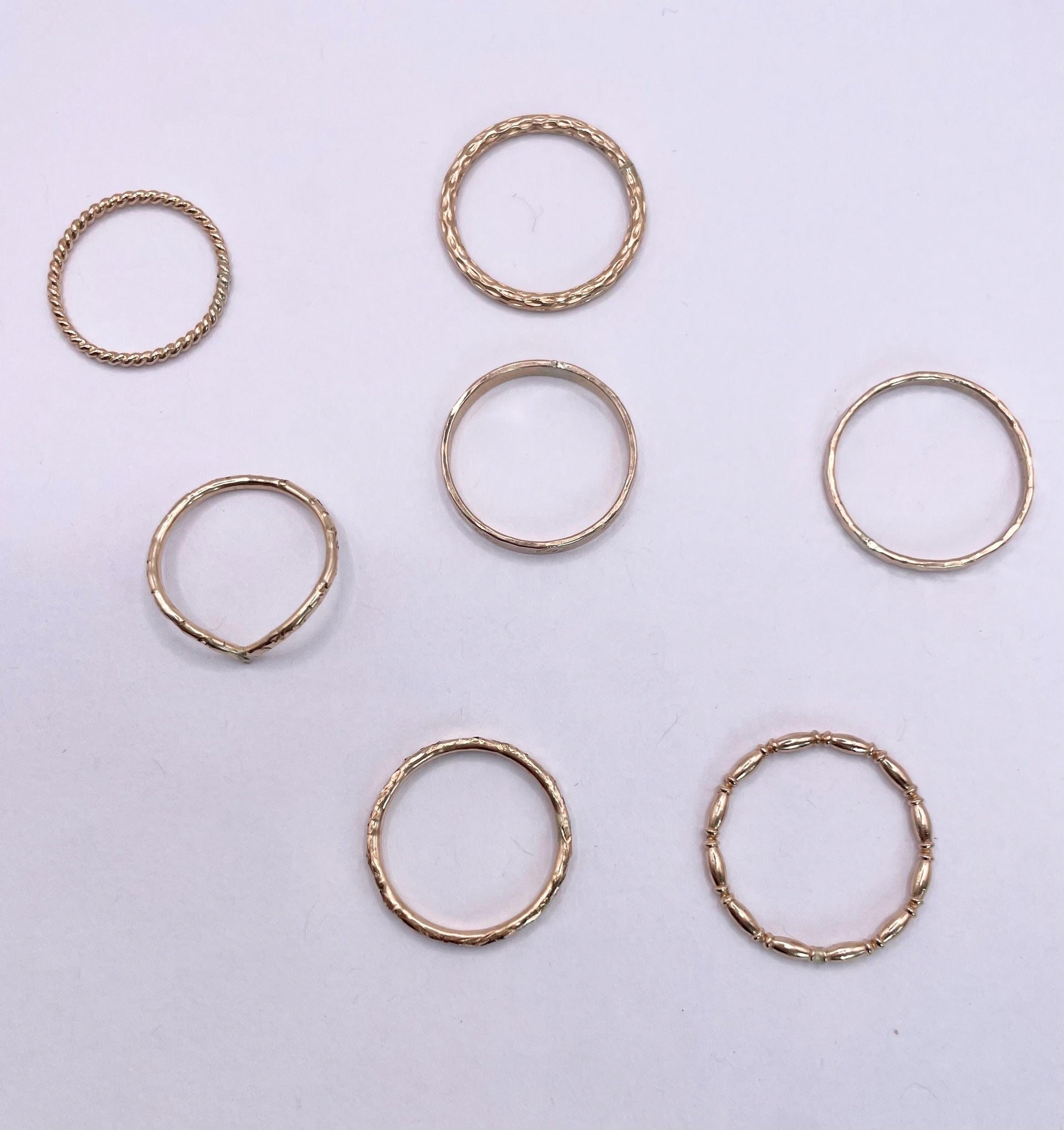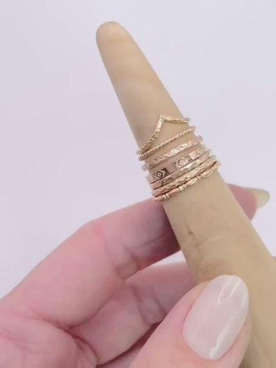 These fun little stackers are fun to mix and match! Wear in the own or stack together; Chevron, twisted, diamond stamped, raw, hammered, round textured, and beaded rings!