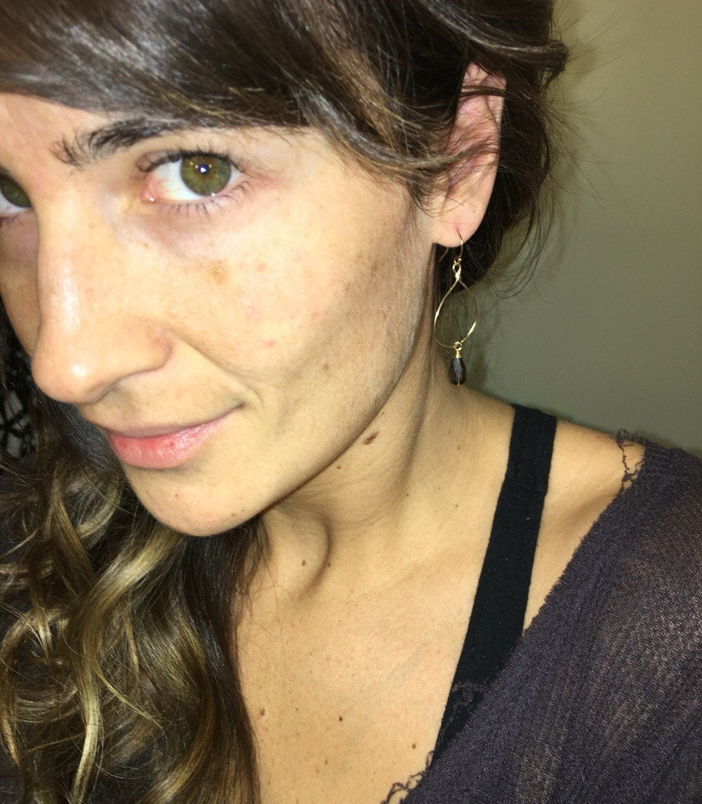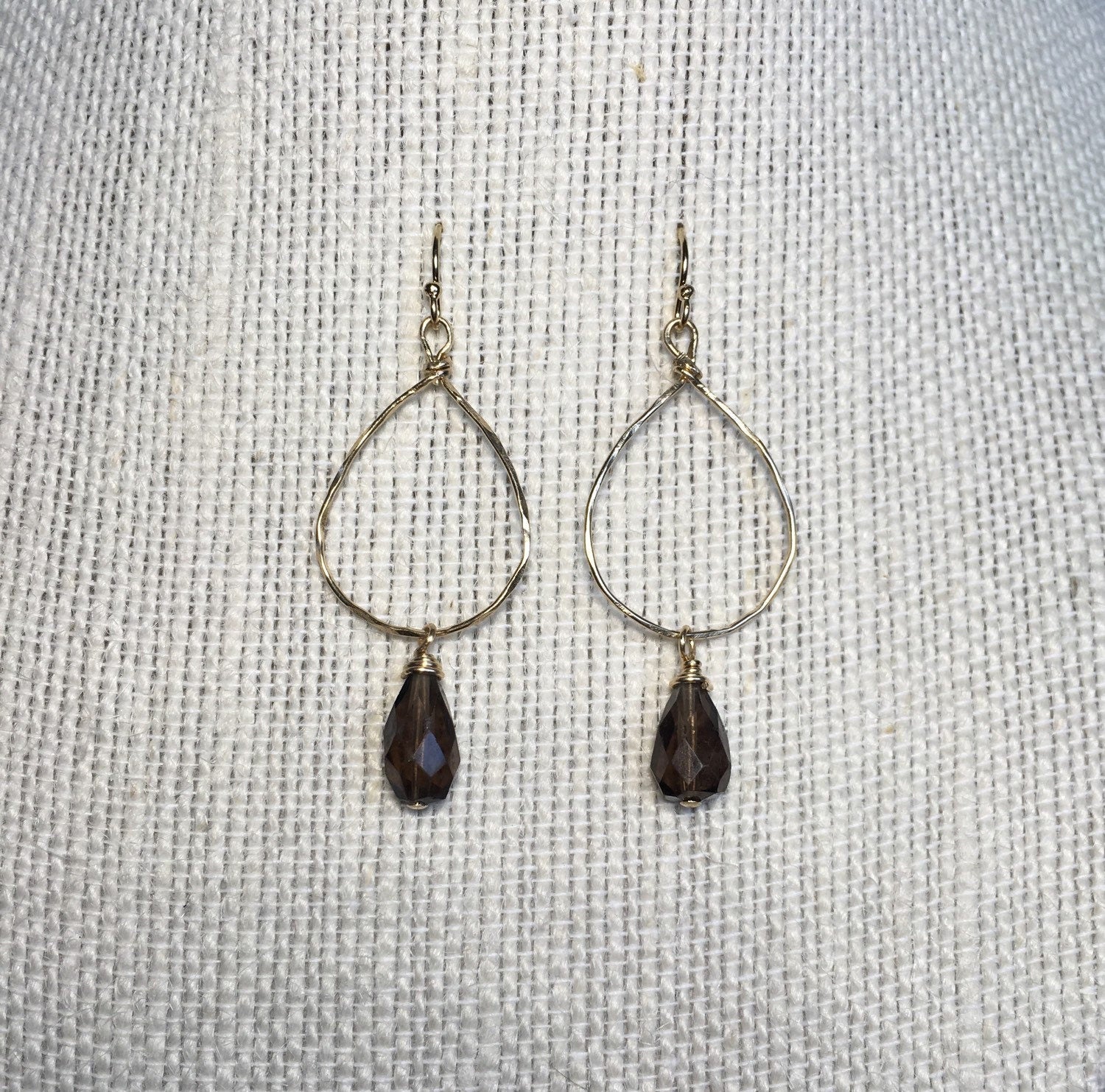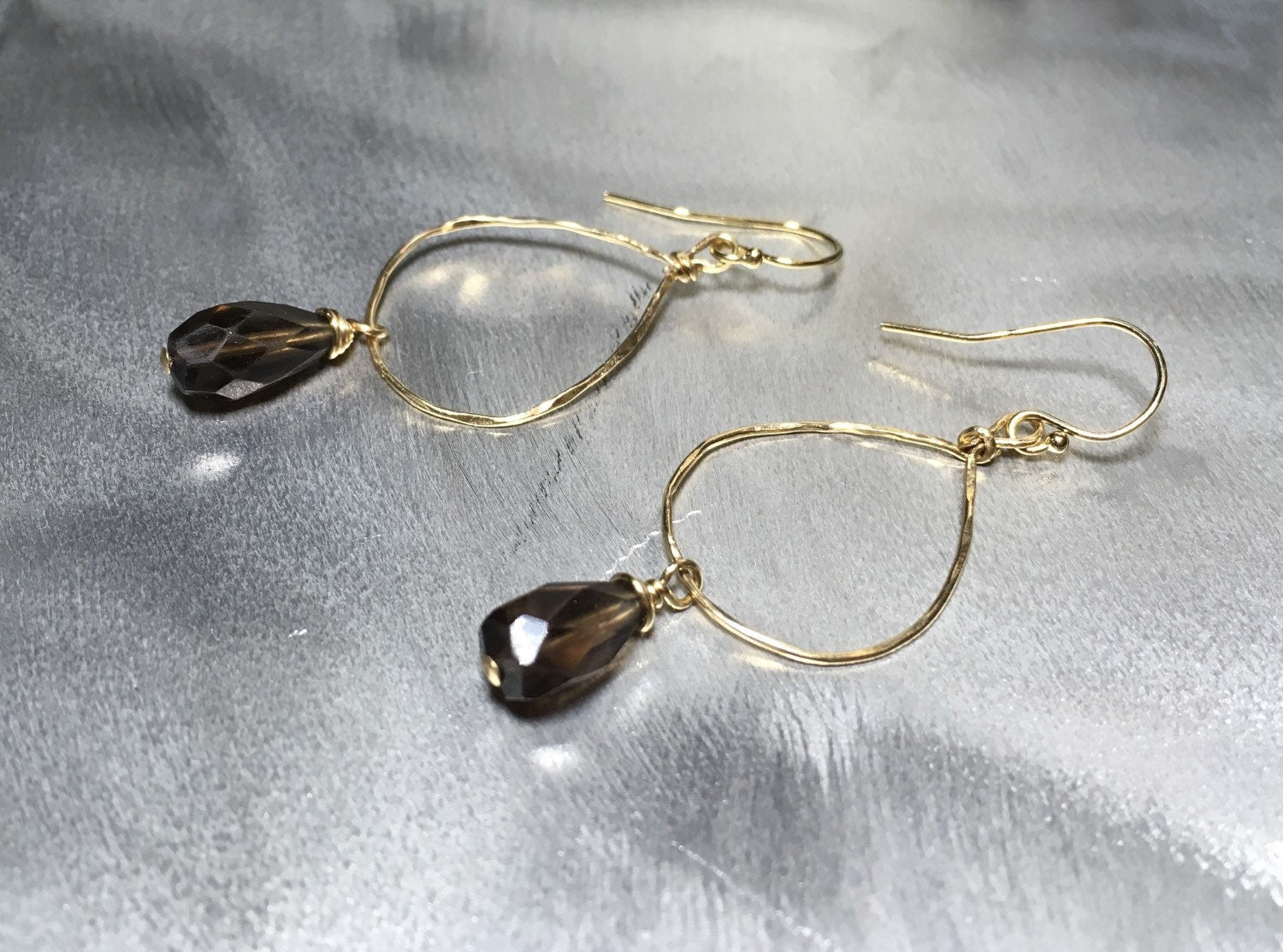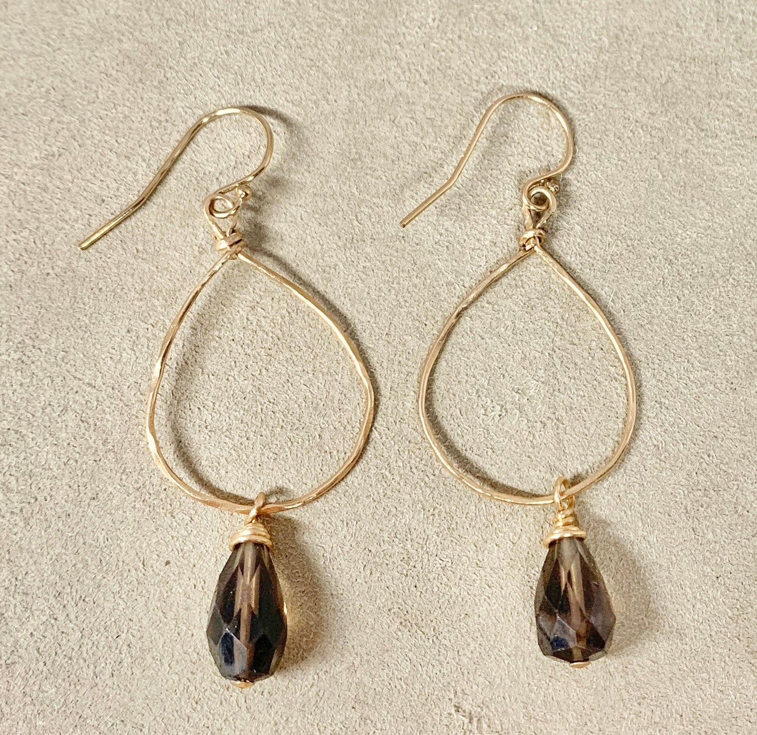 These beauties are 14ky gold filled hammered hoop earrings with genuine smokey quartz. These gemstone earrings hang at just over 1.5 inches and are feather light so they can be worn all day and night without giving you achy earlobes. A gorgeous accessory for any occasion!