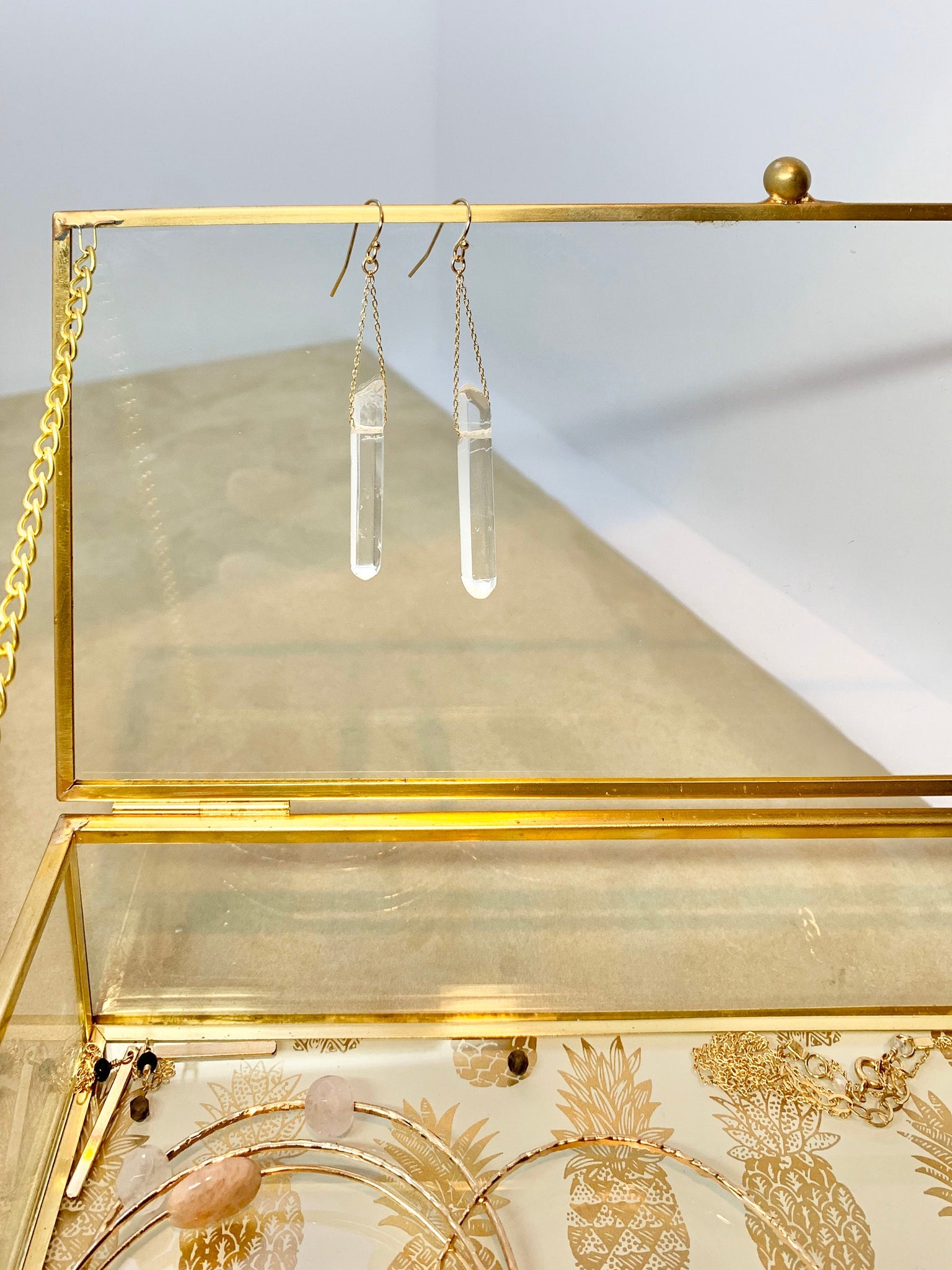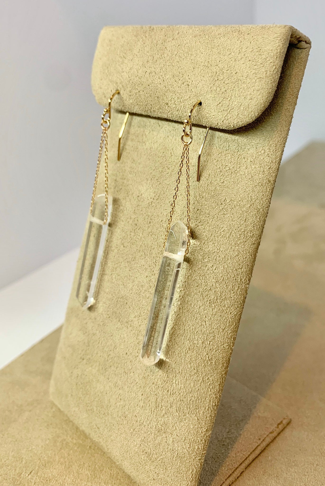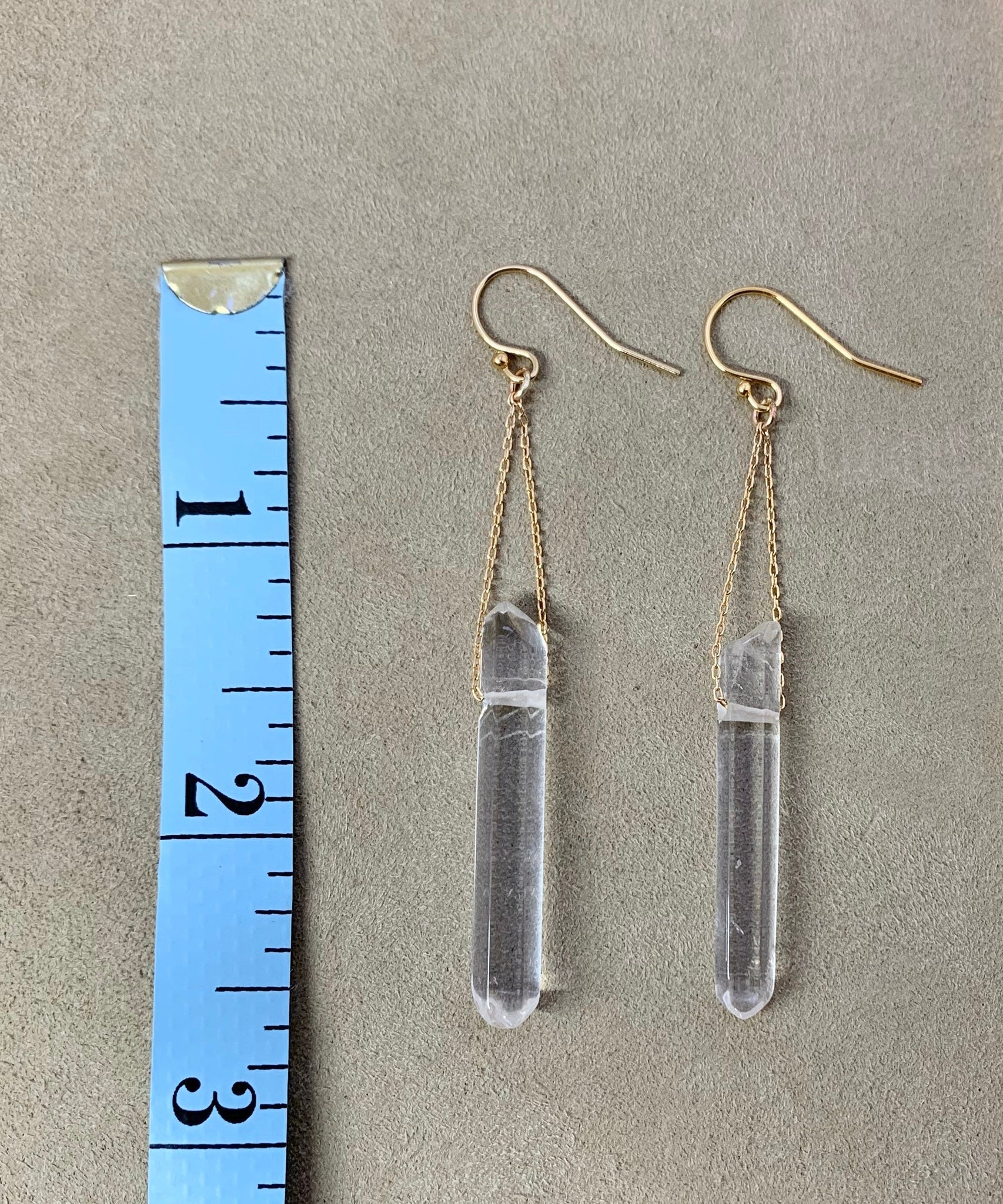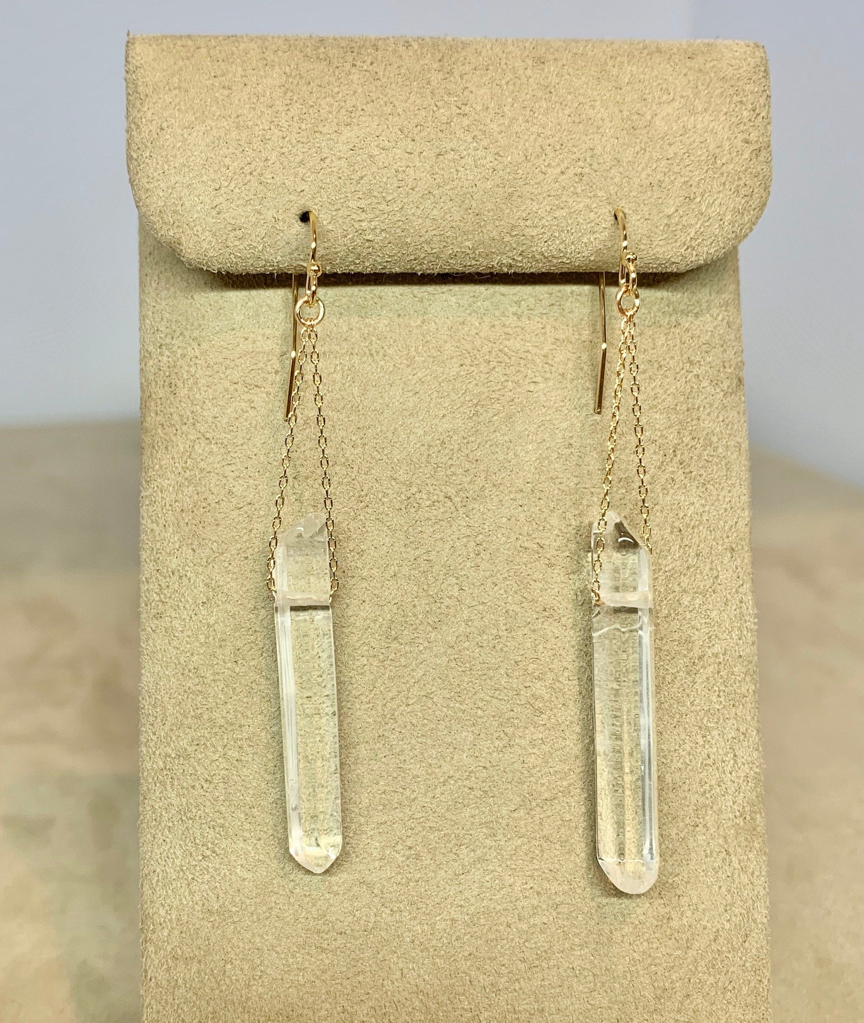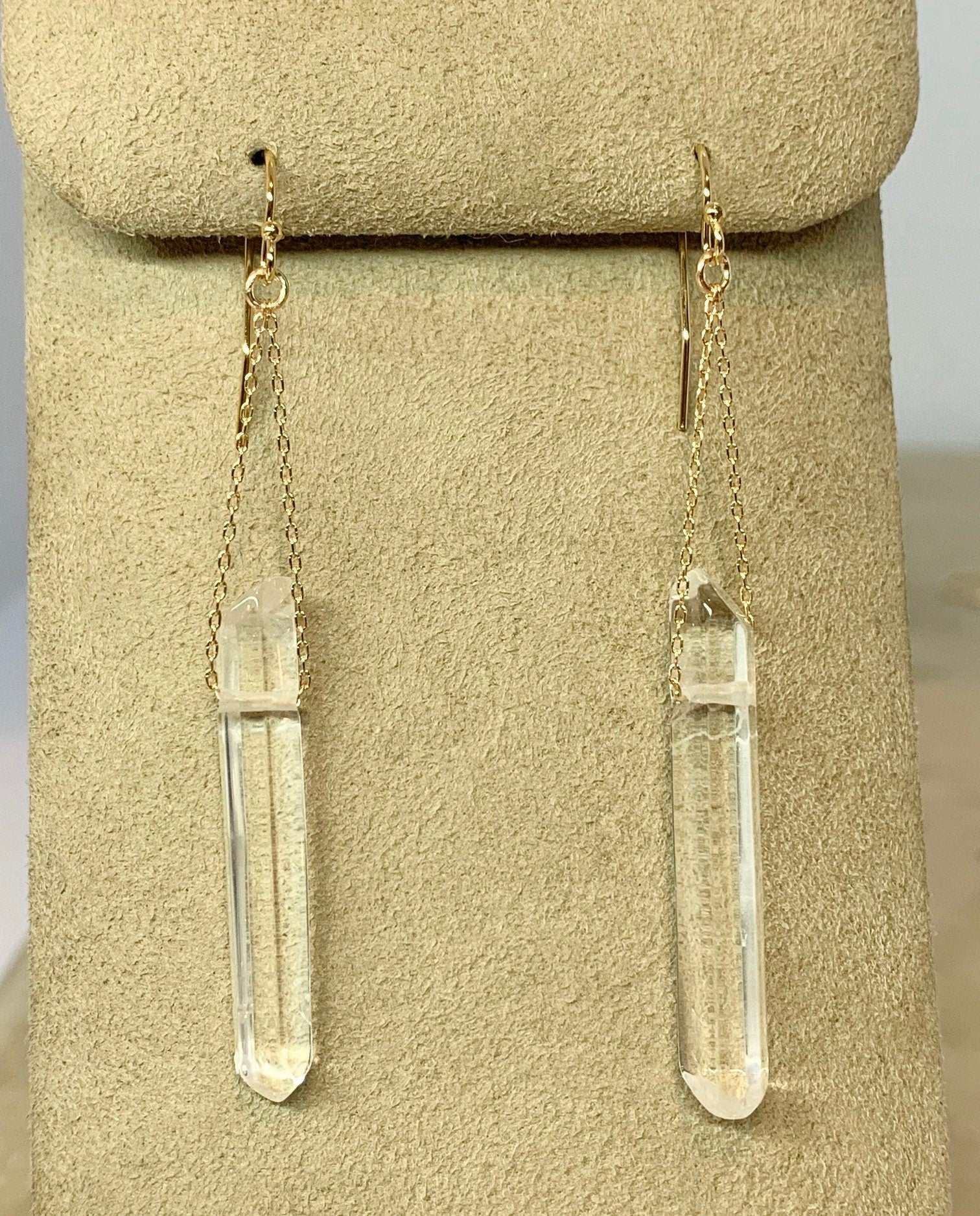 Simple yet bold these gorgeous genuine quartz crystal earrings hang from 14k gold filled fine cable chain on 14ky gold filled ear hooks. As no two crystals are the same the pair of earrings are not identical, I match them as close as I can. They are nice and light so you can wear them all day long they won't bother your ears or irritate them!