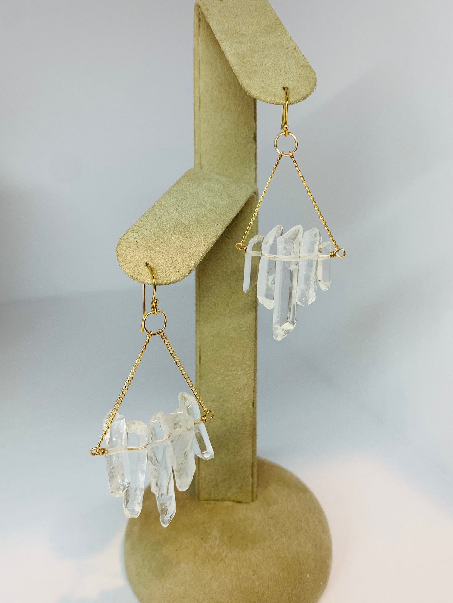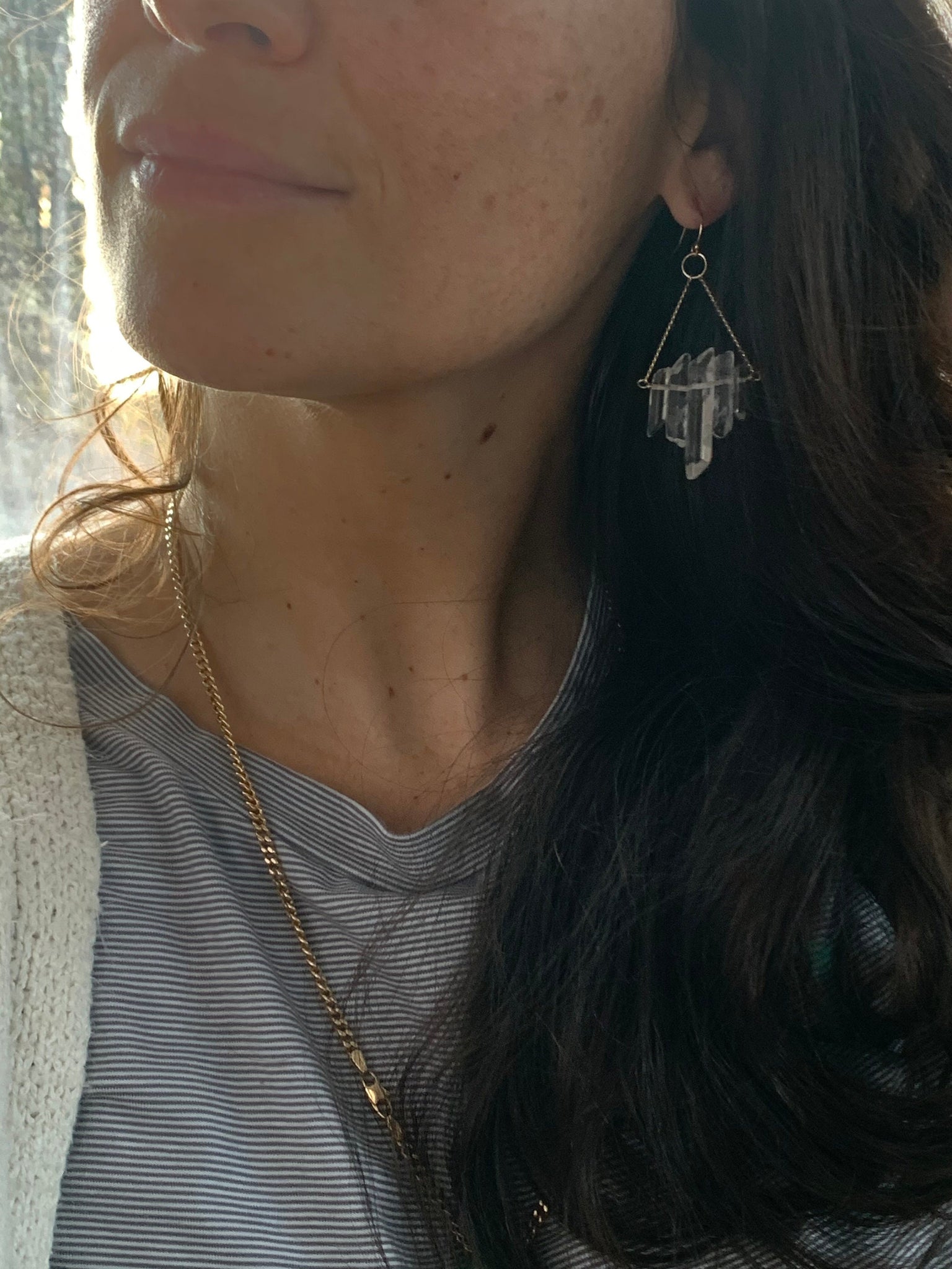 These lovely statement earrings showcase natural clear quartz crystals. Being natural Means no two crystals are alike so these paired earrings will All slightly differ from one another though their unique beauty hanging from 14k gold filled chain On 14k gold filled ear hooks they will not tarnish or irritate your ears at all!