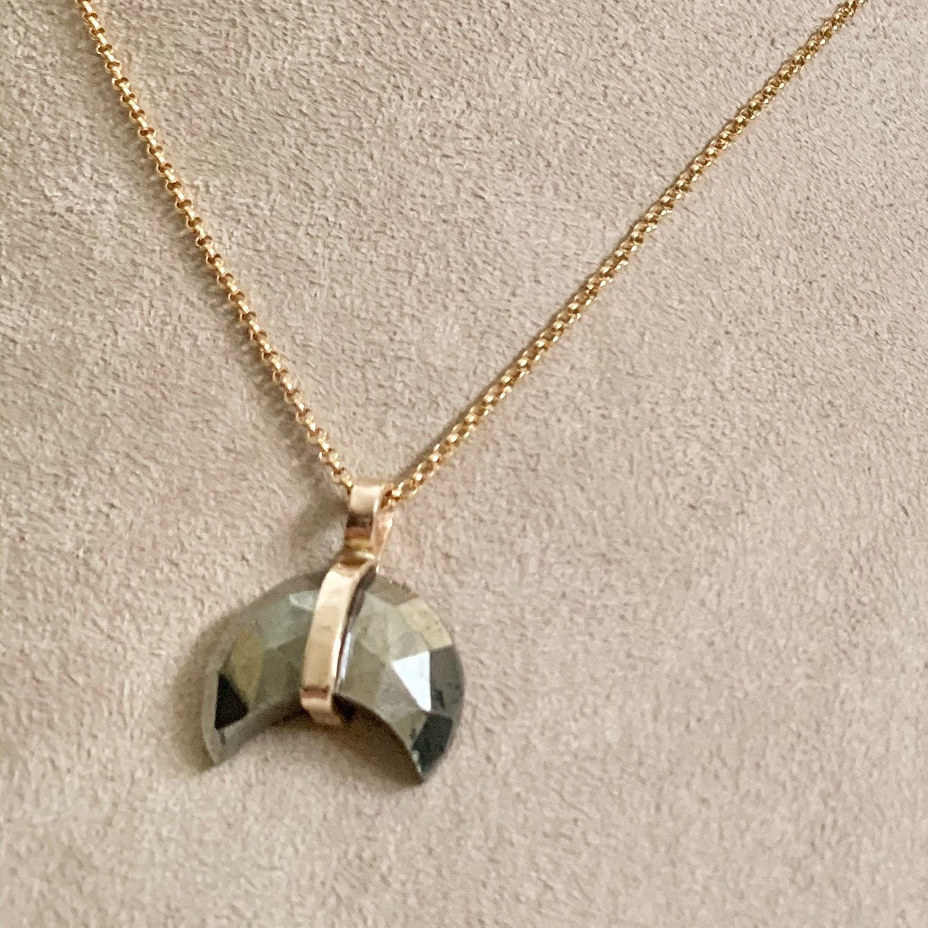 This beautiful 14k gold filled faceted crescent moon pyrite is set in a hand formed and soldered 14k gold filled setting made by me, hanging on a nice sturdy 14k gold filled rolo chain (pictured wearing a 16 inch chain) you pick the length you wish. Perfect for layering or a lovely statement all in its own.