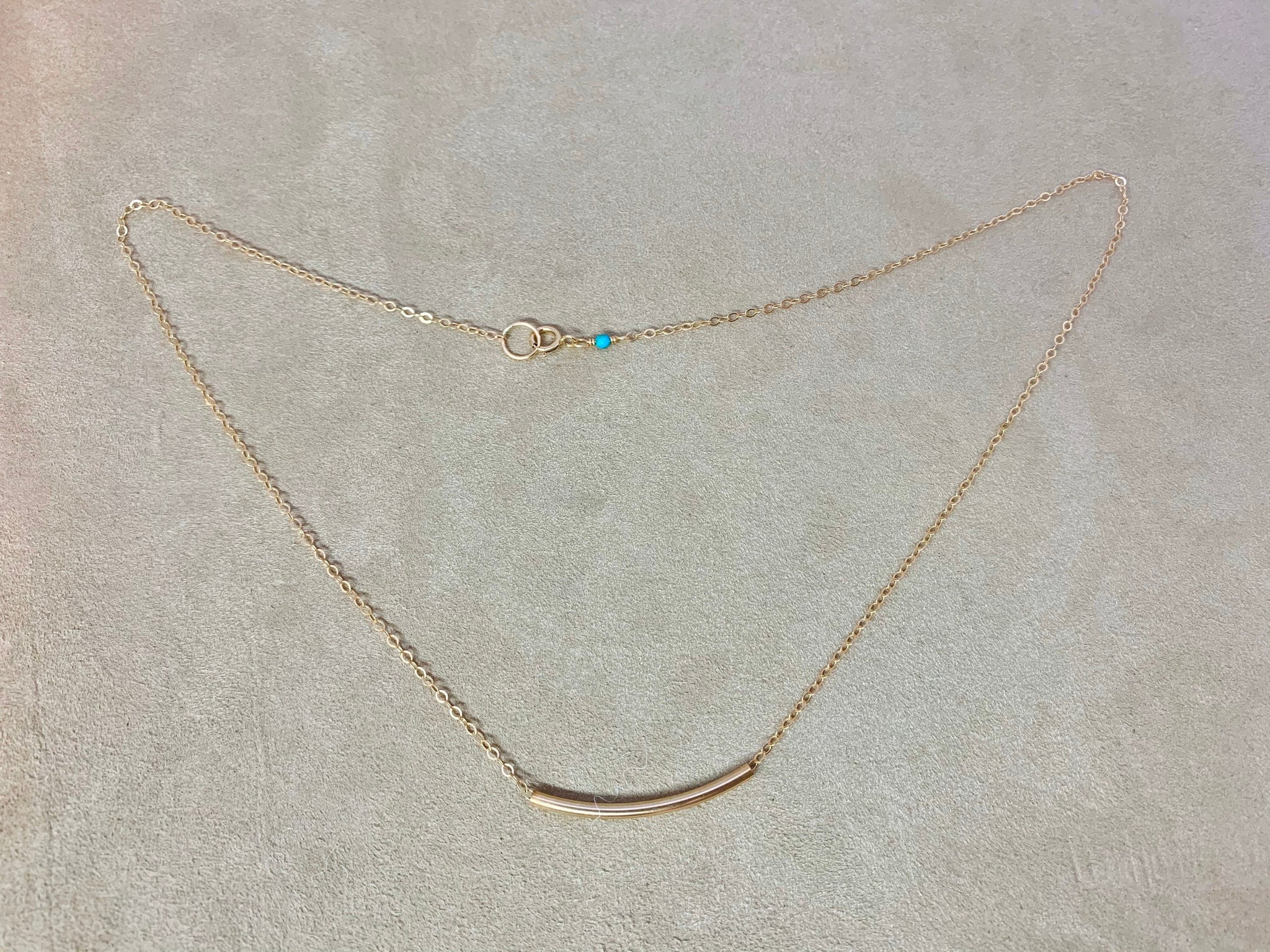 The dainty curved tube bead is 9k gold filled on a sparkling 14k gold filled cable chain. All components are gold filled except for the tiny faceted genuine turquoise stone attaching the spring ring clasp to the chain.
