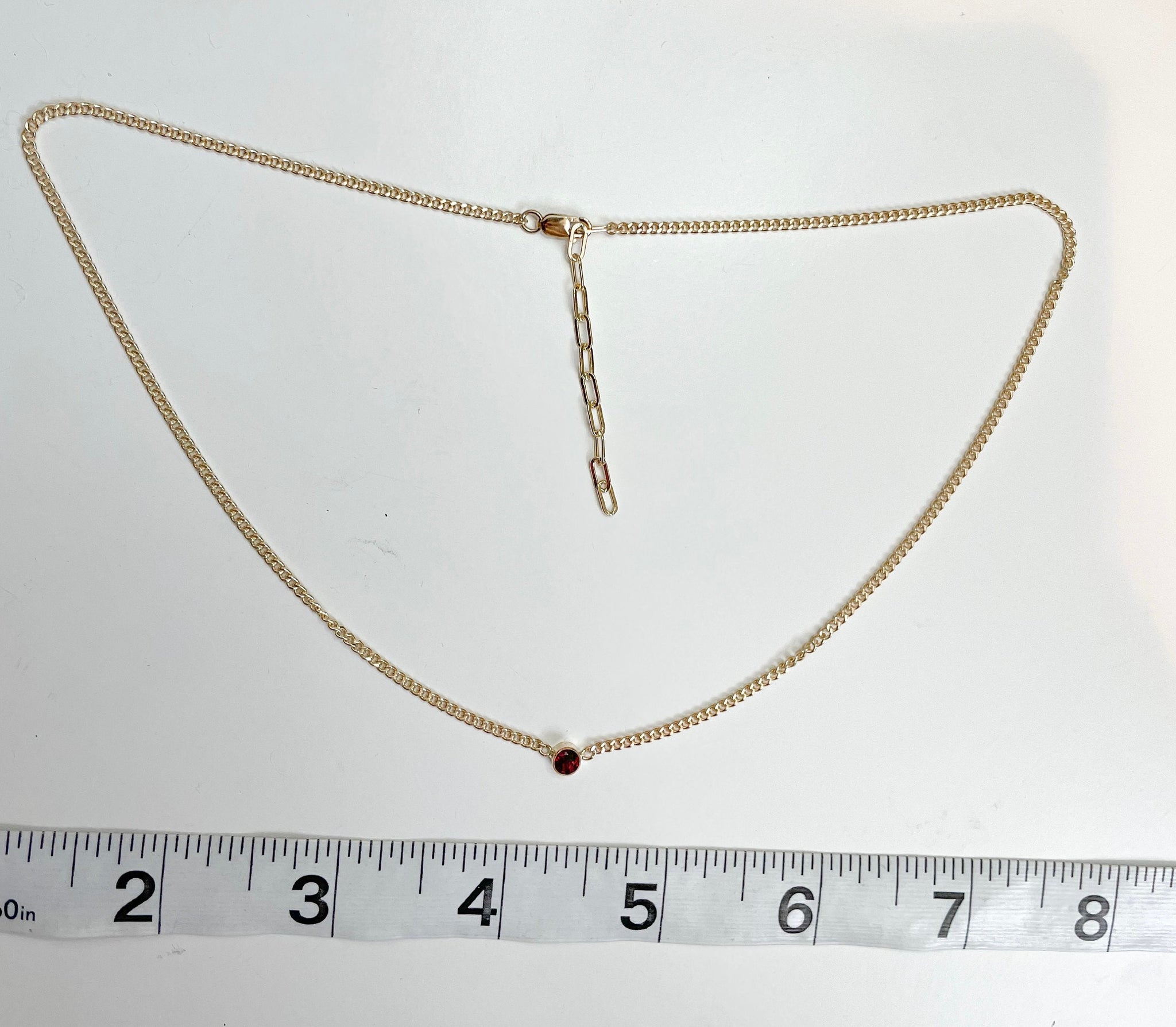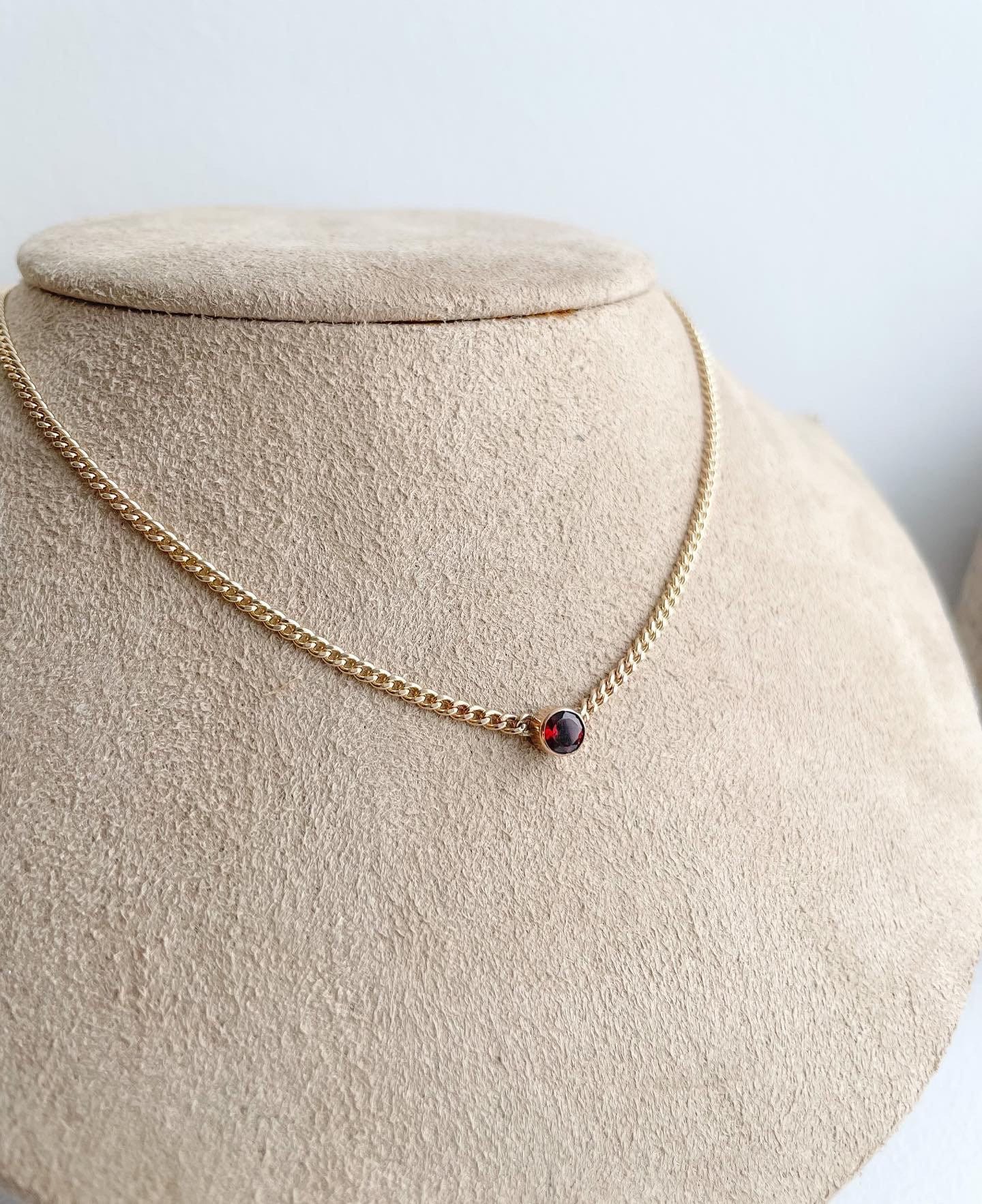 This little 14k gold filled bezel setting holds a 4mm genuine garnet gemstone and hangs from a lovely heavy Andy sturdy 14k gold filled curb chain 16 inches long with a two inch extender.