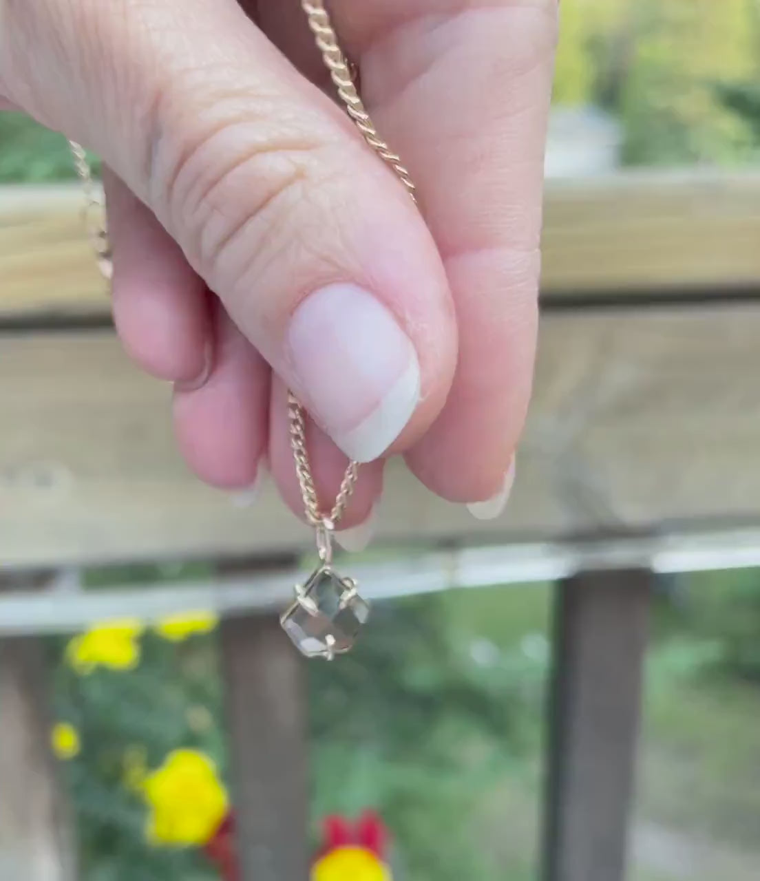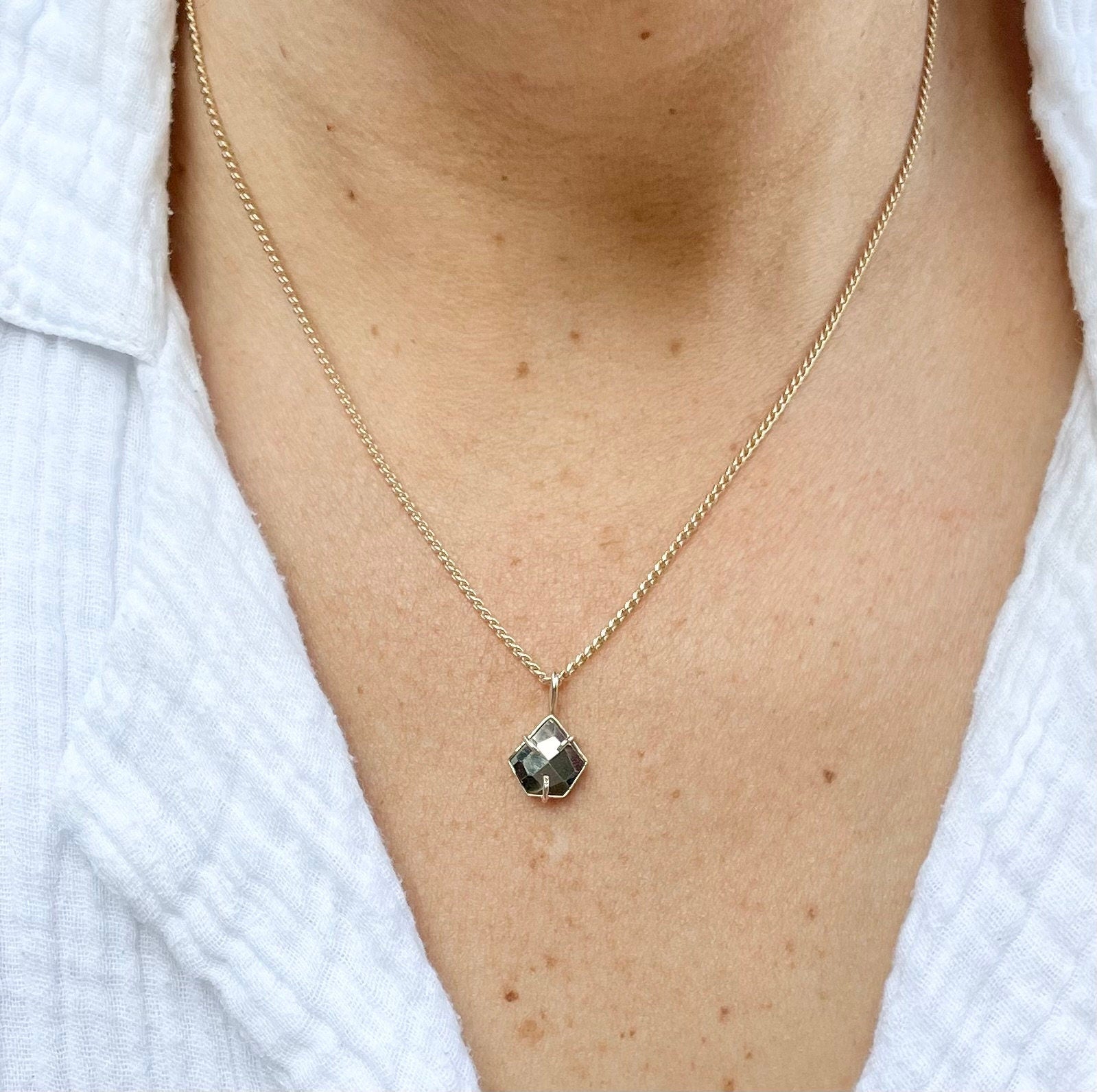 14k gold filled (about 3mm wide) 18 inch curb chain. With a 14k gold filled lobster clasp and soldered on end loop. Genuine pyrite kite about 8-10mm wide and 8-10mm long set in 14k gold filled setting handmade by me.