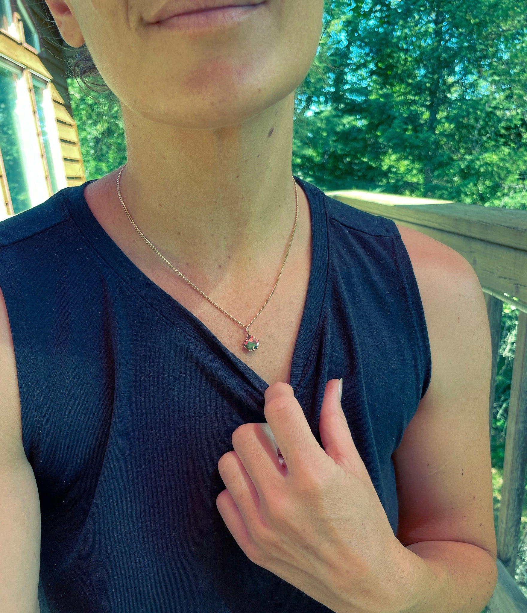 To care for this necklace can be cleaned with mild soap, water and pat dry with a soft cloth. It can also be cleaned with a gold jewelry polishing cloth or put in an ultrasonic cleaner.