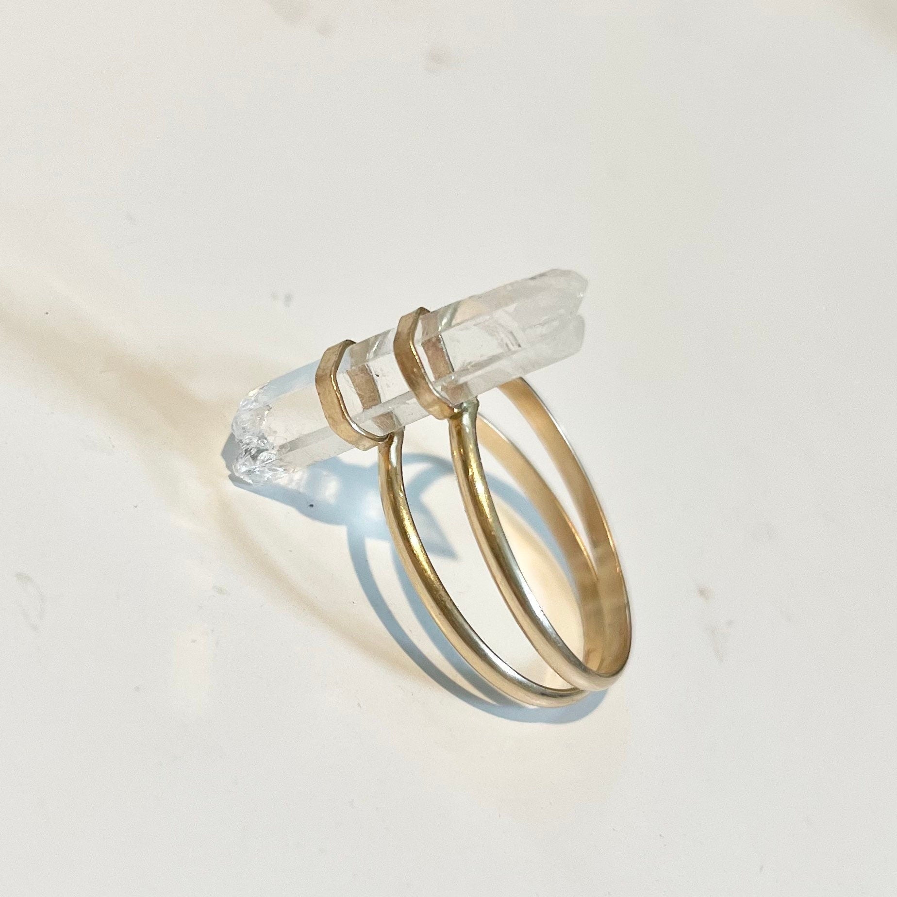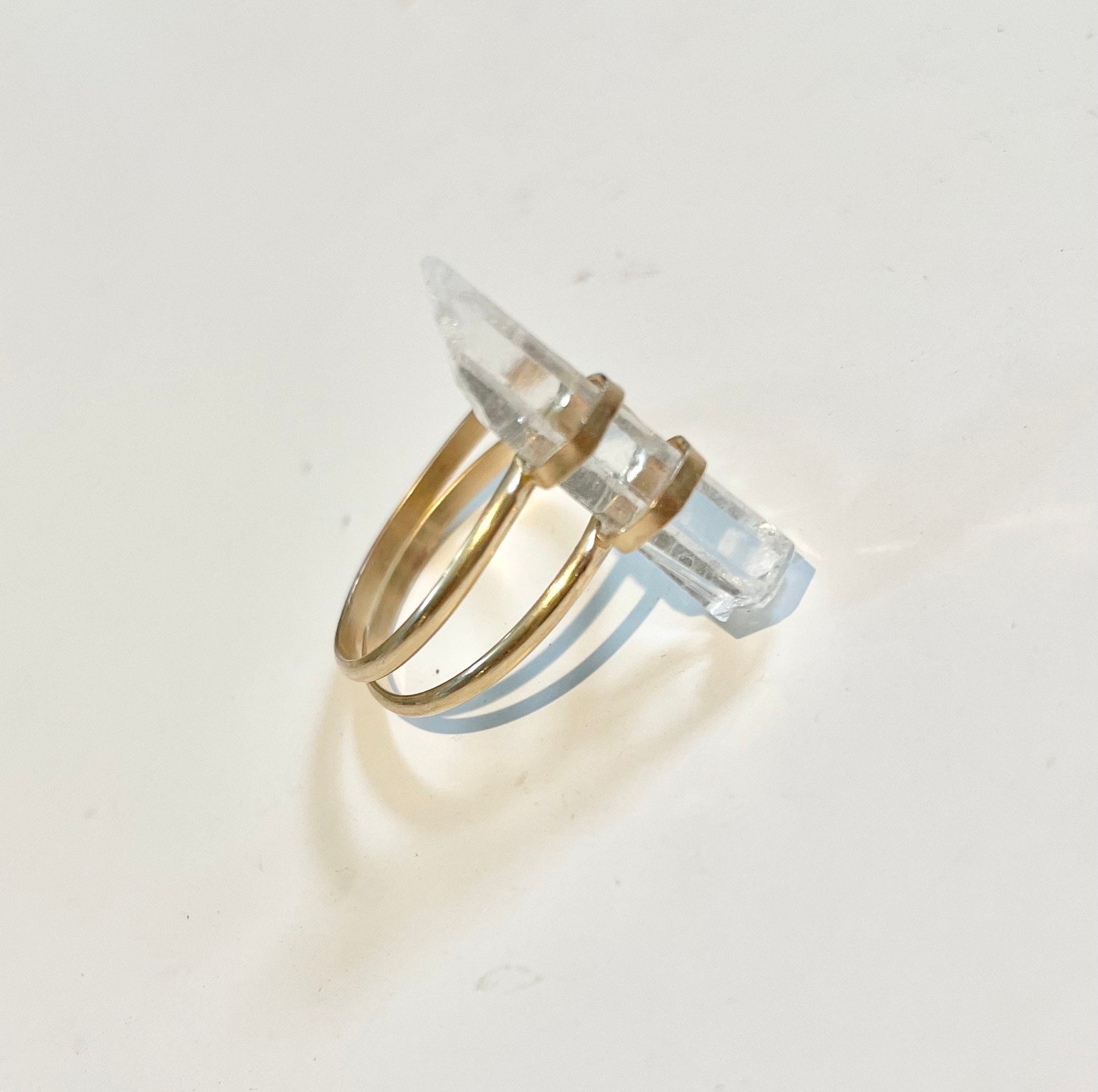 Genuine raw clear quartz point and 14k gold filled setting and double banded ring.