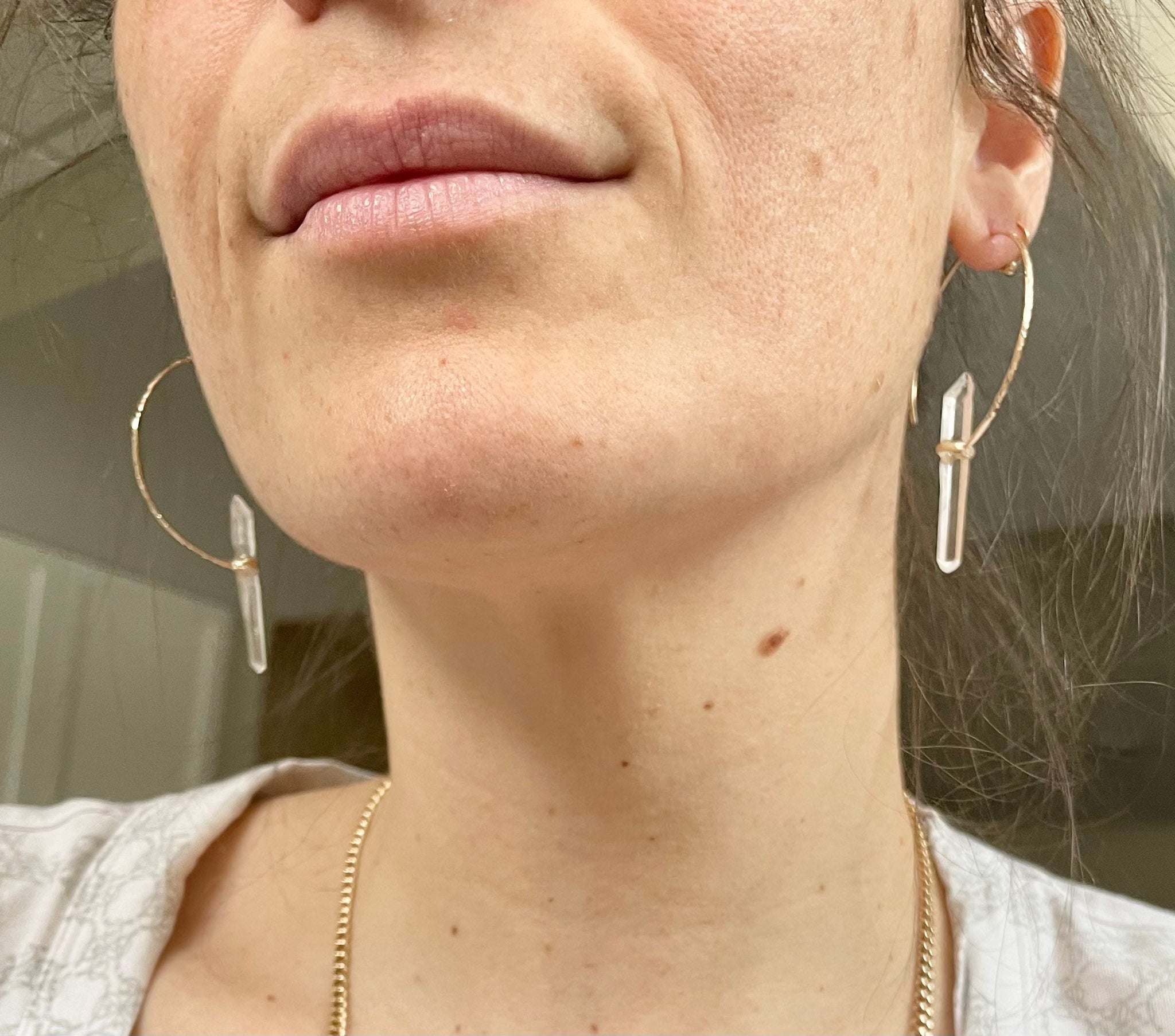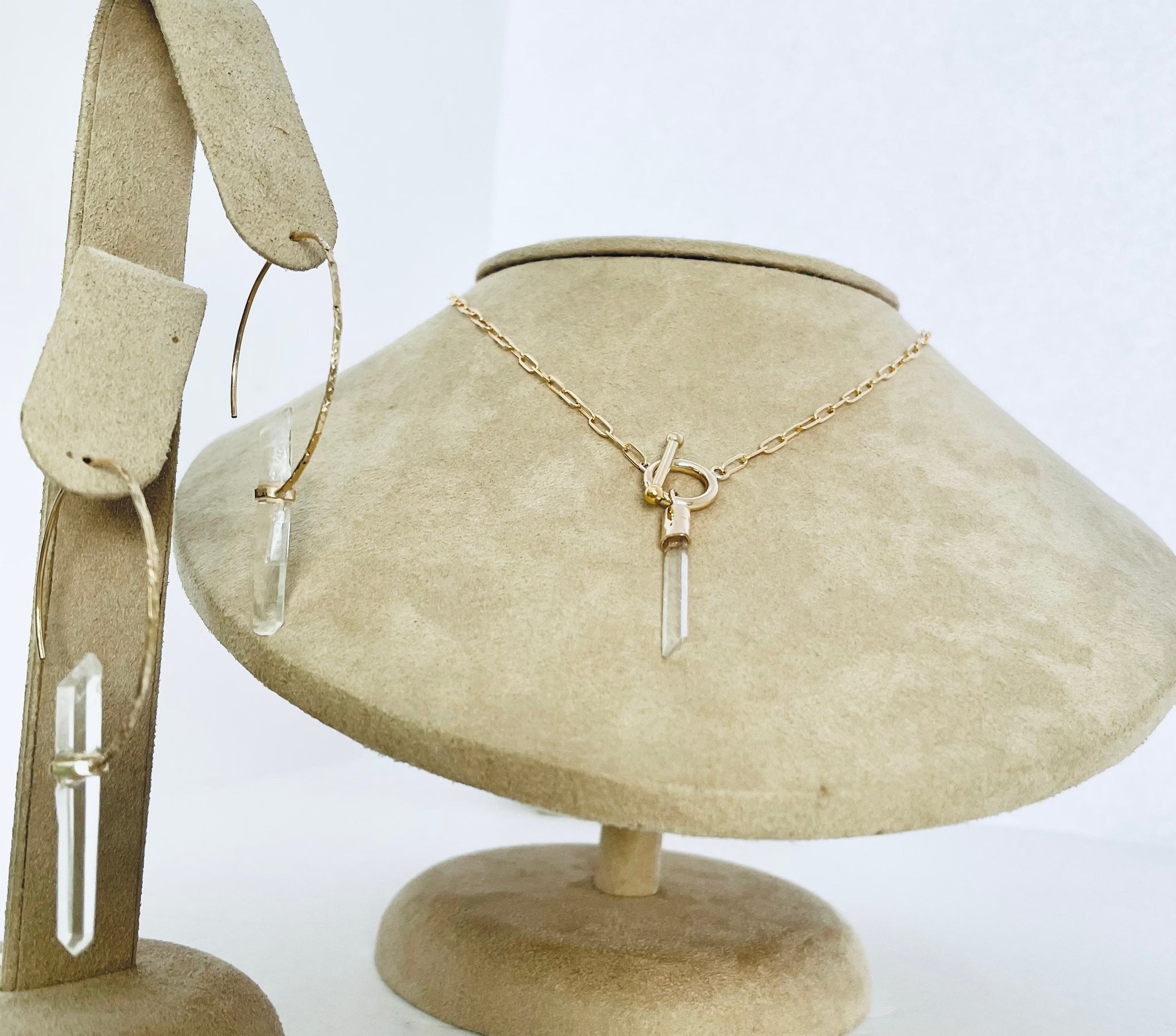 Raw Clear quartz crystal hoop earrings. Feel the energy of these beautiful raw 1 inch long raw quartz crystal hoop earrings, simply striking! Set in a hand formed 14k gold filled hoop setting made by me.
