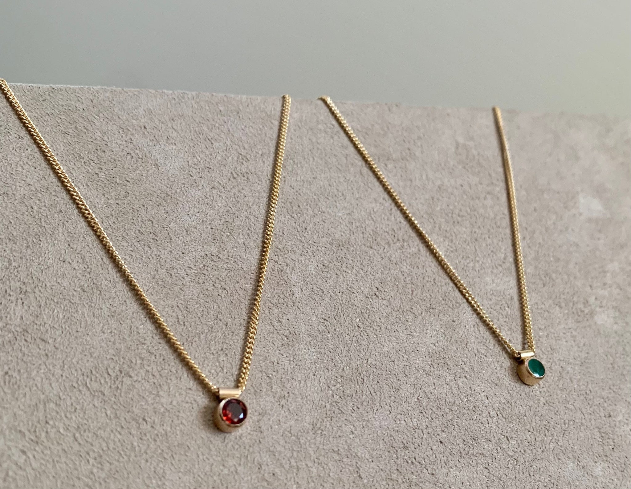 This little 14k gold filled bezel setting holds a 4mm genuine garnet gemstone and hangs from a lovely 14k gold filled chain your choice of a fine curb chain, or fine cable chain.